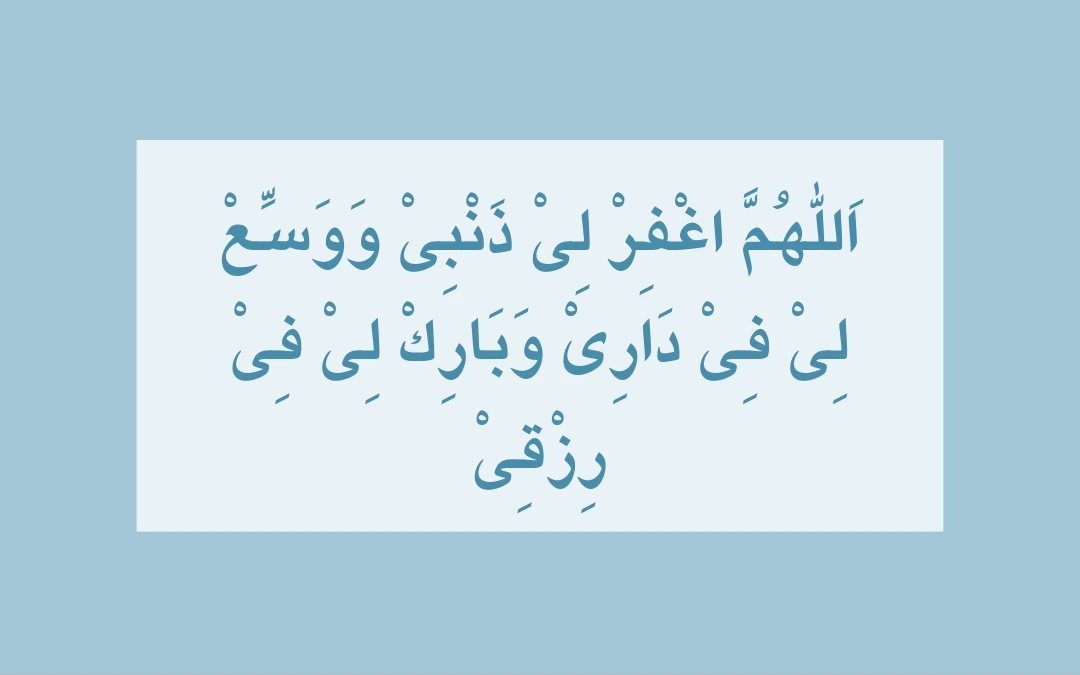 Translation: Oh Allah, forgive my sins, expand my home for me, and bless my livelihood.